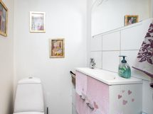 - Pesutilojen kuvaus: Pesuhuone remontoitu n. 1999 ed. omist. aikana. Lattialämmitys. Lattia ja seinät ovat laatoitettu. Erillisen WC:n kuvaus: Peilikaappi, wc-istuin, allas + allaskaapisto, käsisuihku, lattialämmitys. Lattia on laattaa, seinät ovat maalattu.