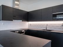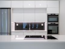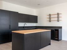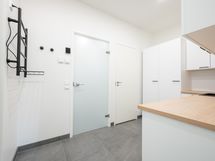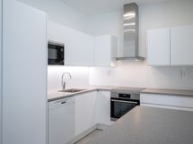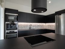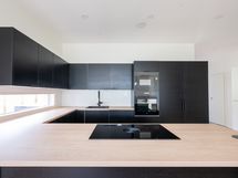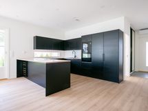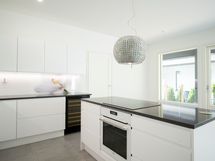 Keittiön varusteet: Jääkaappi, erillinen pakastin, erillisuuni, liesituuletin, astianpesukone ja keittiösaareke. Liesi: Induktioliesi. Työtason materiaali: Laminaatti. Rakentajan materiaalioppaan mukaan.
