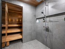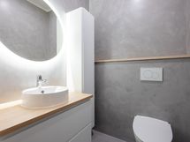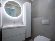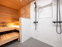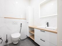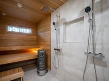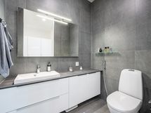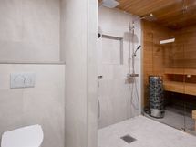 Pesutilojen varusteet: WC-istuin, lattialämmitys, bidee-suihku, suihku ja suihkuseinä. Pesutilojen kuvaus: Rakentajan materiaalioppaan mukaan. Erillisten WC:n lukumäärä: 1. Erillisen WC:n varusteet: WC-istuin, lattialämmitys, bidee-suihku ja peilikaappi.