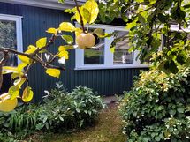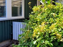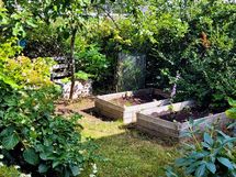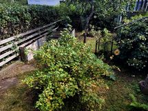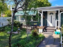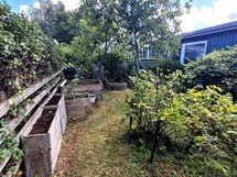 - Molemmin puolin asuntoa pensaiden ja puiden täyttämä puutarha.