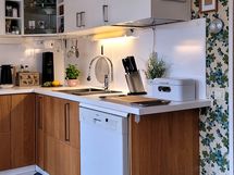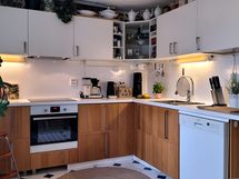 - Tilaa isolle ruokapöydälle, Paljon kaappitilaa, Paljon työskentelytilaa, Laminaattitasot, Astianpesukone, Pesukoneliitos, Induktioliesi, Liesi tai uuni erikseen, Liesituuletin, Jääkaappi, Pakastin. Keittiö on laajennettu poistamalla väliseinä keittiöln ja yhden makuuhuoneen väliltä. Mahdollisuus palauttaa asunnon huonejärjestys tarpeen vaatiessa alkuperäiseksi. Eli 4 h + k.