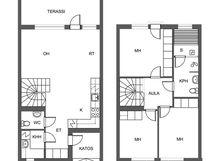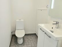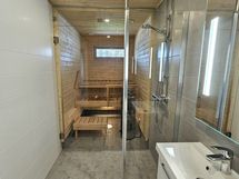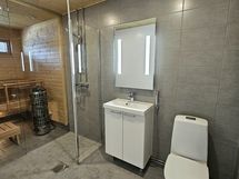 Alakerrassa on erillinen kodinhoitohuone ja wc. Yläkerran saunan pesuhuoneessa on toinen wc ja suihkutila.