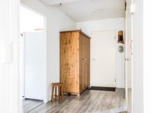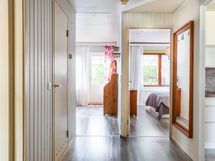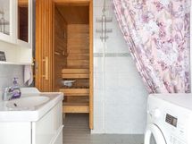 - Sauna, sähkökiuas, kylpyhuone, suihku, peilikaappi, allaskaappi, pesukoneliitäntä, lattialämmitys sähkö, kiinteät valaisimet.