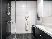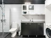 Suihku, Pesukoneliitäntä, Vesikiertoinen lattialämmitys, Tilaa pesukoneelle, Käsisuihku, Kaapisto, Allas, Suihkuseinä, WC-istuin