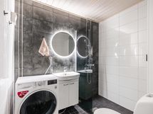 - Remontoitu tyylikäs kylpyhuone. Suihku, allaskaappi, peili, kaappi, pesukoneliitäntä