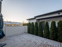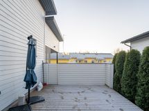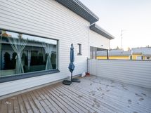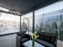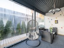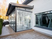 - Osa terassista suojattu lasilla ja osa jätetty auki. Turvareunus lasien takana.