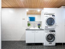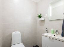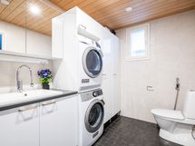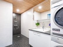 - Pesutilojen varusteet: Suihku, allaskaappi, pesuallas, peilikaappi, bidee-suihku, lattialämmitys ja pesukoneliitäntä. Pesutilojen kuvaus: Tilavan pesuhuoneen yhteydessä hyvin laskutilaa, pesuallas ja pesukoneliitäntä. Erillisten WC:n lukumäärä: 1. Erillisen WC:n varusteet: WC-istuin, allaskaappi, peilikaappi, bidee-suihku ja lattialämmitys.