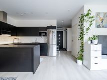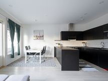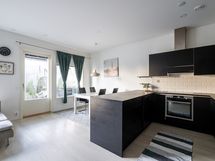 - Keittiön varusteet: Jääkaappipakastin, mikroaaltouuni, liesi, erillisuuni ja astianpesukone. Liesi: Induktioliesi. Työtason materiaali: Laminaatti. U-mallinen tilava moderni keittiö, johon on vaihdettu suurempi tiskiallas.