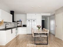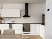 - Työtason materiaali: Laminaatti. Integroitu täyskorkea jääkaappi ja pakastekaappi, induktiotaso, erillisuuni, musta liesituuletin (Savo), integroitu astianpesukone. Välitila: Kaakeli.