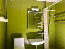 Pesutila/wc:n seinät peltielementtiä, lattia muovimattoa, kylpyamme poistettu, nyt suihku.