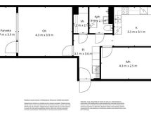 Pinta-alan peruste: Yhtiöjärjestyksen mukainen ja isännöitsijäntodistuksen mukainen. Ei tarkistusmitattu. Pinta-alat saattavat tämän ikäisissä kohteissa (yhtiö rekisteröity ennen 01.01.1992) poiketa olennaisestikin asuinrakennusten nykyisten mittaustapojen ja standardien (SFS 5139) mukaan laskettavasta asuintilojen pinta-alasta. Pinta-ala voi siis olla edellä mainittua pienempi tai suurempi.
