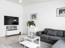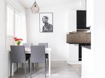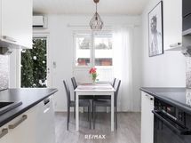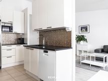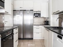 Keittiö on remontoitu vuonna 2018. Valkoiset kaapistot, tummat työtasot ja välitilan kaakelointi muodostavat ajattoman ja selkeälinjaisen kokonaisuuden. Induktioliesi, uuni, astianpesukone, täysikorkeat jääkaappi ja erillinen pakastin tekevät kokkailusta sujuvaa.