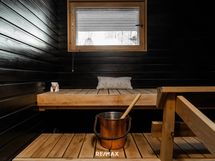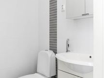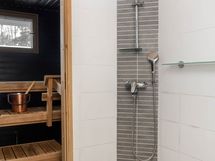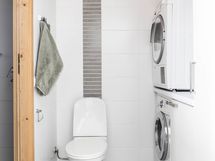 Kylpyhuone ja erillinen wc-tila on uusittu samaisena vuonna 2018. Vaalea laatoitus, harmaa tehosteseinä suihkutilassa ja puupintainen katto tuovat tilaan lämpöä ja neutraalia ilmettä. Sauna jatkaa harmonista linjaa tummaksi maalatulla puuverhoilulla ja pienellä ikkunalla, joka tuo tilaan luonnonvaloa. Erillinen wc on remontoitu samaan aikaan ja varustettu lattialämmityksellä, allaskaapilla sekä peilikaapilla. Kylpyhuoneen yhteydessä oleva erillinen kodinhoitotila helpottaa arkea, sillä pesutornille on oma paikkansa ja säilytysratkaisut on mietitty käytännönläheisesti.