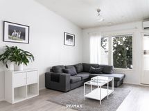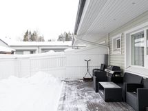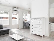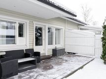 Tutustuessasi tähän kohteeseen, huomiosi kiinnittyy hivenen normaalia korkeampaan olohuoneen huonekorkeuteen ja suuriin ikkunoihin. Valo kulkee esteettä olohuoneen, ruokailutilan ja keittiön läpi, ja avoin pohjaratkaisu tekee kokonaisuudesta selkeän ja toimivan. Lattiat on uusittu vuonna 2019 ja vaalea laminaatti sekä maalatut seinäpinnat luovat rauhallisen pohjan sisustukselle. Olohuoneesta on suora kulku katetulle länteen avautuvalle terassille, jossa ilta-aurinko viipyy pitkään ja tilat jatkuvat luontevasti ulos.