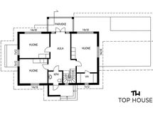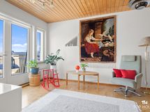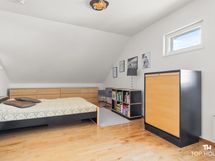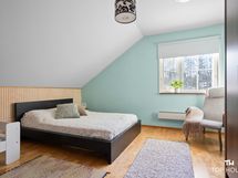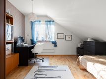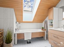 Yläkerta antaa kodille oman viehättävän lisänsä. Aula toimii erinomaisesti oleskeluun, työpisteeksi tai vaikka rauhalliseksi lukunurkkaukseksi, ja se tekee yläkerrasta enemmän kuin pelkän makuuhuonekerroksen. Myös yläkerran kylpyhuone on erityisen viihtyisä ja tunnelmallinen tila, jossa vinot katot ja kattoikkuna tuovat tilaan persoonallisuutta ja valoa.