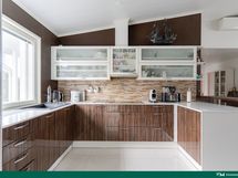 Kaapistot, kvartsi tasot, liesitalo, uuni, mikro, jääkaappi/viilea, pakastinkaappi, liesikupu, astianpesukonen. Lattia: Laatta. Seinät: Maalattu