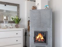 Vuolukivi takka (varaava). Lattia: Paketti. Seinät: Maalattu