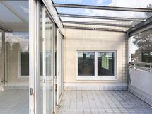 Se mikä tekee tästä kodista lähes poikkeuksellisen, on hulppean suuri kattoterassi tulisijalla. Terassi on kuin oma piha taivaan alla: paikka, jossa grilliruoan tuoksu tuo veden kielelle, kukat ja yrtit kukoistavat ruukuissaan ja ystävät kokoontuvat yhteen kaupungin maisemia ihaillen.