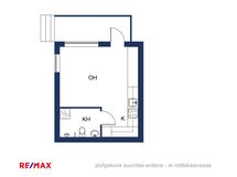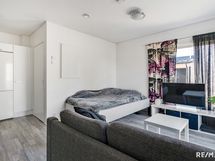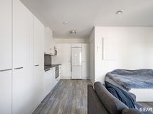 Oleskelu, ruokailu ja nukkuminen muodostavat toimivan kokonaisuuden, jossa suuret ikkunat tuovat tilaan runsaasti luonnonvaloa. Vaaleat pinnat ja yhtenäinen laminaattilattia korostavat tilan avaruutta, ja keittiö on varusteltu arkea helpottavilla ratkaisuilla, kuten induktioliedellä ja astianpesukoneella.