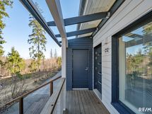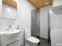 Kylpyhuone on siisti ja lämminhenkinen kokonaisuus, jossa vaalea laatoitus, puupaneelikatto ja lasiseinällä rajattu suihkutila tekevät arjesta sujuvaa. Tilaa löytyy myös pesukoneelle, ja lattialämmitys lisää mukavuutta.