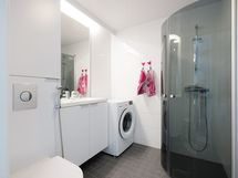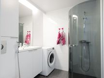 - Pesutilojen varusteet: WC-istuin, suihku, suihkuseinä, lattialämmitys, peili, pesuallas, allaskaappi, bidee-suihku ja pesukoneliitäntä. Pesutilojen kuvaus: Tilava kylpyhuone. Erinomaisessa kunnossa.