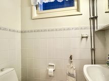 - Kylpyhuone: suihku, allaskaappi, suihkuseinä, wc-istuin. Sauna: sähkökiuas. Kodinhoitohuone/makuuhuone: pesukoneliitäntä, pyykinpesukone. Erillinen wc: wc-istuin, peilikaappi, pesuallas. Lattia: Kylpyhuone, sauna, erillinen wc: laatta. Kodinhoitohuone/mh: korkki. Seinät: Kylpyhuone: laatta. Sauna: puu. Kodinhoitohuone/mh: maalattu. Erillinen wc: laatta, maalattu