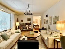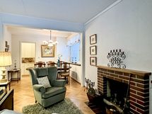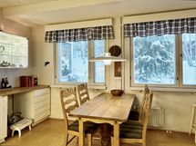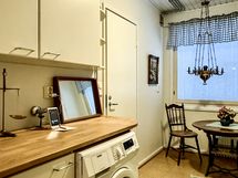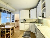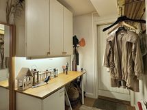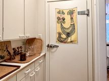 - Jääkaappi/pakastin, kylmiö, astianpesukone, astianpesukoneliitäntä, sähköliesi, liesikupu/-tuuletin, kaapistot, marmoritasot. Lattia: Korkki. Seinät: Maalattu