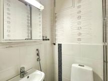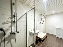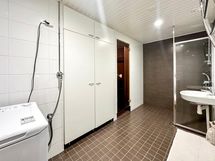 - Erillinen wc: peilikaappi, allaskaappi ja pesuallas. Psh: suihku, suihkuseinä, käsienpesuallas, kiinteät valaisimet, kylpyhuonekaapisto (siivouskomero ja pyykkikomero kaappien runko vanha, ovet uudet), pesukoneliitäntä (mahtuu myös pesutorni), pyyhekuivain. Sauna: sähkökiuas. Saunan panelointi, lauteet, ovi ja kiuas uus. 2010. Wc.n pinnat uus. 2010. Psh uusittu talotekniikkasaneerauksen yhteydessä 2017. Psh.n lattialämmitys (sähköllä) uusittu 2017.