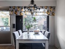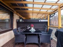 Keittiö ja olohuone muodostavat viihtyisän kokonaisuuden, joka jatkuu suojaisalle takapihalle. Katettu terassi tarjoaa mainion paikan rentoutumiseen ja oleskeluun.