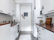 Liesi: keraaminen, erillisuuni. Kylmäsäilytys: jääkaappi/pakastin. Varustus: liesituuletin, astianpesukone, kiinteät valaisimet.