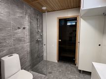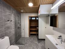 Varustus: suihkuseinä, pesukoneliitäntä, wc-istuin, suihku, kiinteät valaisimet, kylpyhuonekaapisto.