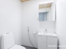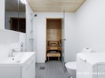 Varustus: suihkuseinä, lattialämmitys, wc-istuin, suihku, peilikaappi, kiinteät valaisimet. Varustus: lattialämmitys, bidee-suihku.