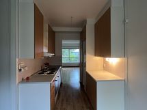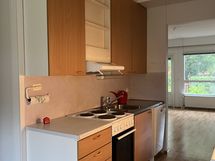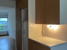 Liesi: sähköliesi. Työtasot: laminaatti. Kylmäsäilytys: jääkaappi. Varustus: liesituuletin, kiinteät valaisimet.
