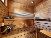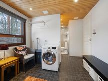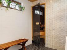 Kylpyhuoneessa yhdistyy tyylikkyys ja toiminnallisuus. Saunan pehmeät löylyt tarjoavat täydellisen rentoutumishetken kiireisen päivän päätteeksi.