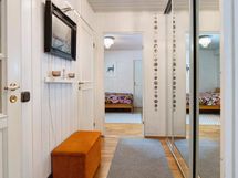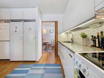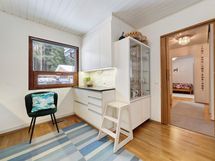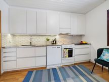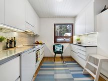 Keittiössä vaaleat kaapistot ja hillitty välitilan laatoitus tuovat modernin mutta ajattoman ilmeen. Säilytystilaa on runsaasti, ja hyvin varusteltu keittiö tarjoaa puitteet sujuvaan arkeen. Makuuhuoneet ovat rauhallisia ja tarjoavat jokaiselle perheenjäsenelle oman tilansa rentoutumiseen.