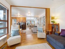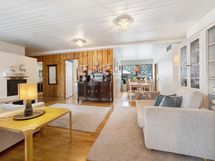 Olohuoneen kaunis valkoinen takka tuo tilaan lämpöä ja tunnelmaa, ja sen ympärille rakentuu kutsuva seurustelualue. Suuret ikkunat takaavat runsaasti luonnonvaloa, ja avara pohjaratkaisu mahdollistaa kodin monipuolisen käytön. Ruokailutila yhdistyy olohuoneeseen, luoden yhtenäisen ja viihtyisän kokonaisuuden.