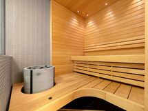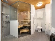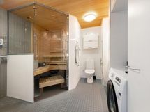 - Kiinteät valaisimet, kylpyhuonekaapisto, lattialämmitys, pesukoneliitäntä, peilikaappi, sähkösauna