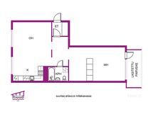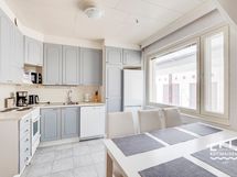 - Keittiön varusteet: Astianpesukone, jääkaappipakastin, liesituuletin, liesi ja mikroaaltouuni. Liesi: Valurautaliesi. Työtason materiaali: Laminaatti.
