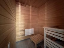 Kiuas: Sähkökiuas. Saunan lauteet irroitettu paikaltaan, koska nykyinen asukas oli pyörätuolia käyttävä. Lauteet ovat tallessa.
