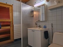 Varusteet: Sähkökiuas. Seinämateriaali: Paneeliseinä. Lattiamateriaali: Muovilattia