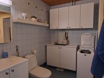 Kylpyhuoneen varusteet: Suihku, suihkuseinä, pesukoneliitäntä, peilikaappi, allas, allaskaappi, wc-istuin.