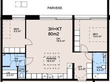 Liesi: erillisuuni, liesitaso. Työtasot: laminaatti. Kylmäsäilytys: jääkaappi/pakastin. Varustus: liesikupu, astianpesukone.