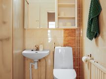 Pesutilojen varusteet: Suihku, wc-istuin, peili, pesuallas ja pesukoneliitäntä.