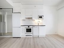 - Jääkaappi/pakastin, uuni, liesi, kaapistot, liesituuletin/ aktiivihiilisuodatin, mikroaaltouuni