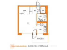 - Pinta-alan peruste: Yhtiöjärjestyksen mukainen ja isännöitsijäntodistuksen mukainen. Ei tarkistusmitattu. Pinta-alat saattavat tämän ikäisissä kohteissa (yhtiö rekisteröity ennen 01.01.1992) poiketa olennaisestikin asuinrakennusten nykyisten mittaustapojen ja standardien (SFS 5139) mukaan laskettavasta asuintilojen pinta-alasta. Pinta-ala voi siis olla edellä mainittua pienempi tai suurempi. Isännöitsijäntodistuksen mukaan yj:n mukainen pinta-ala 29m² ja jyvitetty pinta-ala 27,5m².