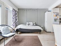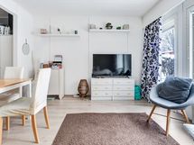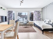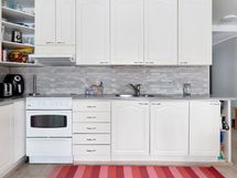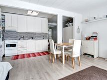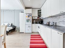 - Keittiön varusteet: Jääkaappipakastin ja liesituuletin. Liesi: Keraaminen liesi. Työtason materiaali: Laminaatti.