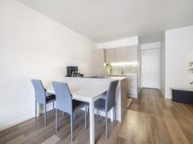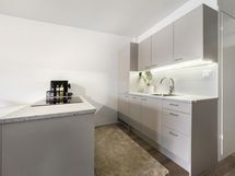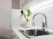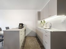 - Integroitu jääkaappi ja pakastin (2024), integroitu astianpesukone (Whirlpool 2024), uuni (Elvita 2024), induktioliesi liesituulettimella (2024), kaapistot. Lattia: Vinyylilankku. Seinät: Laatta, maalattu