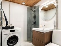 - Suihku ja kääntyvä suihkuseinä, pyyhekuivain (nk rättipatteri)n seinäpeili ja allaskaappi, pesukoneliitäntä, wc-istuin. Lattia: Laatta. Seinät: Laatta