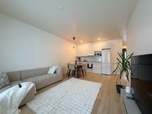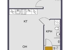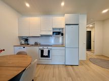 Keittiön varusteet: Jääkaappipakastin, erillisuuni, liesituuletin ja astianpesukone. Liesi: Induktioliesi. Työtason materiaali: Laminaatti.