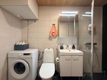 Pesutilojen varusteet: WC-istuin, suihku, suihkuseinä, peilikaappi, bidee-suihku, pesuallas, allaskaappi, lattialämmitys ja pesukoneliitäntä.